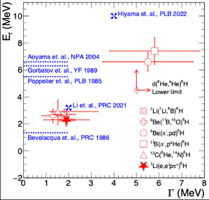 在本研究中,A1合作组提出了实验合成氢6的新方法。使用美因茨加速器MAMI产生的能量为855 MeV的电子束流打锂7靶,氢6可以在7Li(e, e’pπ+)6H反应中产生。使用A1实验室中的三个高精度磁谱仪探测器分别测量散射电子、产生的质子以及π+的动量,再结合三个探测器之间的三重符合信号即可反推出氢6的质量谱。如图二的左图所示,该实验得到了清晰的氢6基态的信号,这是历史上首次在电子束流打靶实验中合成氢6原子核,并测量得到氢6的基态能量为2.3 ± 0.5(stat.) ± 0.4(syst.) MeV/c2,宽度为1.9 ± 1.0(stat.) ± 0.4(syst.) MeV。图二的右图展示了与其它实验测量和理论计算结果的对比,可以看到该实验结果远小于2022年最新的实验测量和理论计算结果,新的测量与中国科学院近代物理研究所团队在2021年的理论计算相近,支持氢6的基态能量和宽度应该较小,说明氢6中的中子之间的相互作用可能比人们预期中的更强。这一成果对原子核结构理论提出了新的挑战,同时为基于电子束流散射实验合成丰中子原子核提供了新的实验方法。