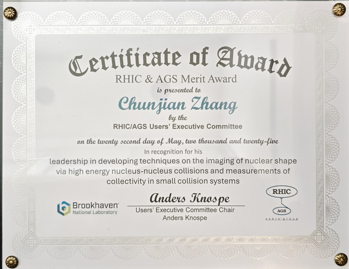 该奖项由布鲁克海文国家实验室RHIC/AGS用户执行委员会(RHIC/AGS Users Executive Committee)设立并颁发,旨在表彰博士毕业十年内,在RHIC、AGS、NSRL、Tandem、BLIP、ATF及未来实验装置相关研究中取得杰出理论或实验成果的青年科学家(每年颁发不超过3位)。张春健博士因在跨能量尺度原子核结构研究及小系统集体流测量方面作的突出贡献(颁奖词:In recognition for his leadership in developing techniques on the imaging of nuclear shape via high energy nucleus-nucleus collisions and measurements of collectivity in small collision systems)而获此殊荣。